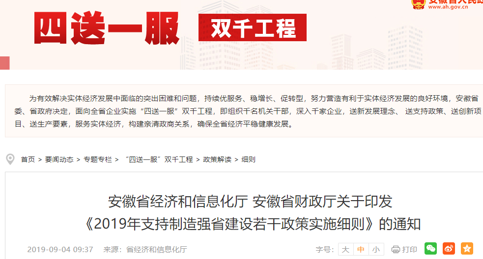 安徽省印發(fā)《關(guān)于印發(fā)支持制造強(qiáng)省建設(shè)若干政策的通知》,對(duì)獲得國(guó)家智能制造試點(diǎn)示范項(xiàng)目的企業(yè)給予一次性獎(jiǎng)補(bǔ)200萬元。 此外,經(jīng)省認(rèn)定的智能工廠、數(shù)字化車間,分別給予企業(yè)一次性獎(jiǎng)補(bǔ)100萬元、50萬元;對(duì)通過國(guó)家信息化和工業(yè)化融合管理體系標(biāo)準(zhǔn)評(píng)定的企業(yè)給予一次性獎(jiǎng)補(bǔ)50萬元;對(duì)年度購(gòu)置10臺(tái)及以上工業(yè)機(jī)器人(自由度≥4)的企業(yè),按購(gòu)置金額的20%給予一次性獎(jiǎng)補(bǔ)。
