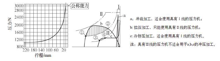 圖為行程壓力曲線,顯示壓力機的行程長度和公稱能力發(fā)生位置、滑塊的下死點上位置和壓力機能夠產(chǎn)生的加壓力之間的相互關(guān)系。從曲線圖上可以看出最大加壓力就是公稱能力,公稱能力發(fā)生的位置就是公稱能力發(fā)生點。從公稱力發(fā)生點到下死點之間可以達到公稱能力,從能力發(fā)生點開始越向上,離下死點的距離越大能夠發(fā)生的加壓力越小。